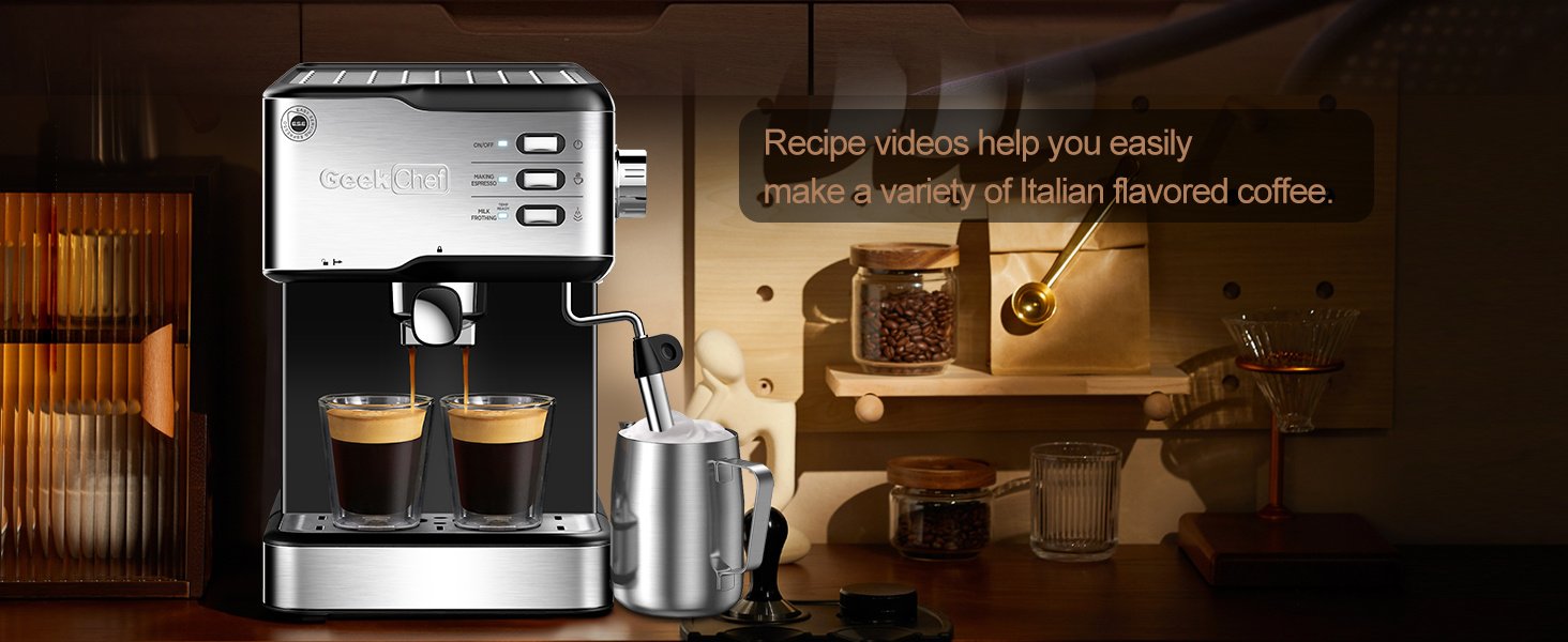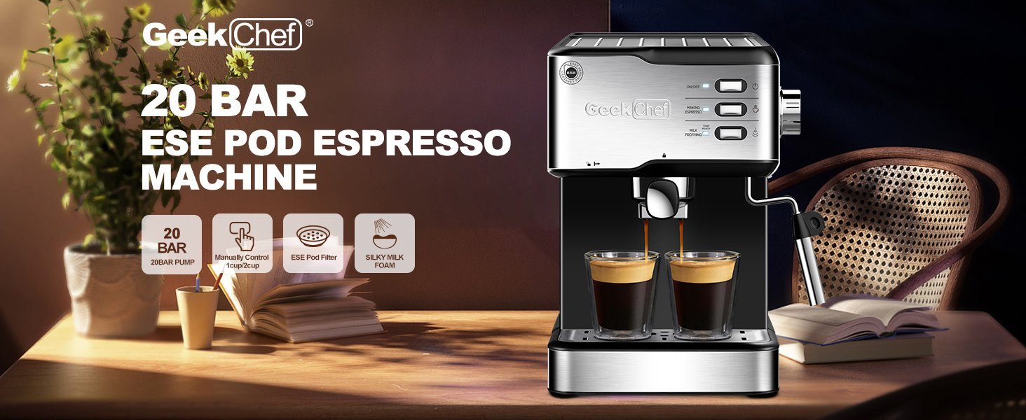 Home > Geek Chef Espresso Machine, Espresso and Cappuccino latte Maker 20 Bar Pump Coffee Machine Compatible with ESE POD capsules filter&Milk Frother Steam