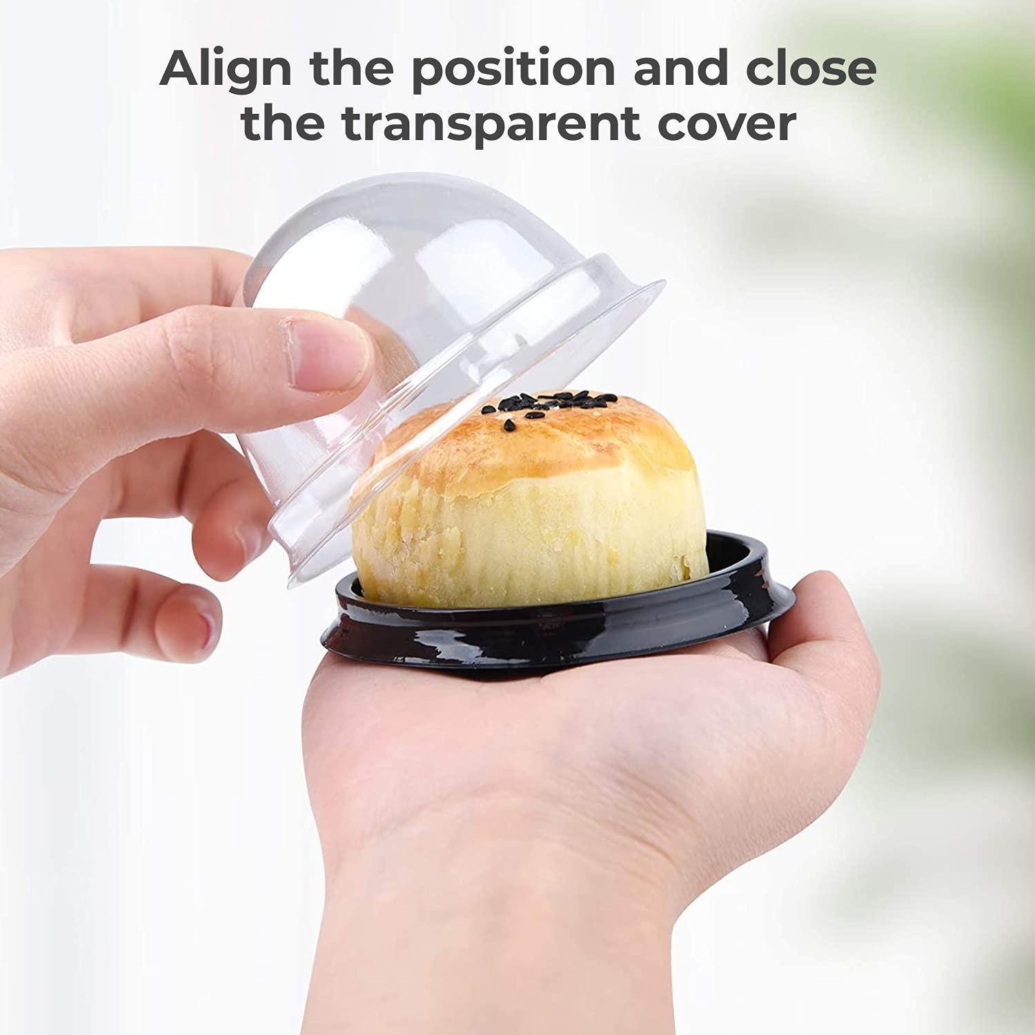 2.Ideal Size of Plastic Container: These mini cupcake holders have a portable size and enough for decorated cupcakes. The bottom of the small mooncake plastic box has about 2.6 In in diameter and 1.96 In in height. Perfect for mini cakes, desserts, biscuits, donuts and cream with chips.