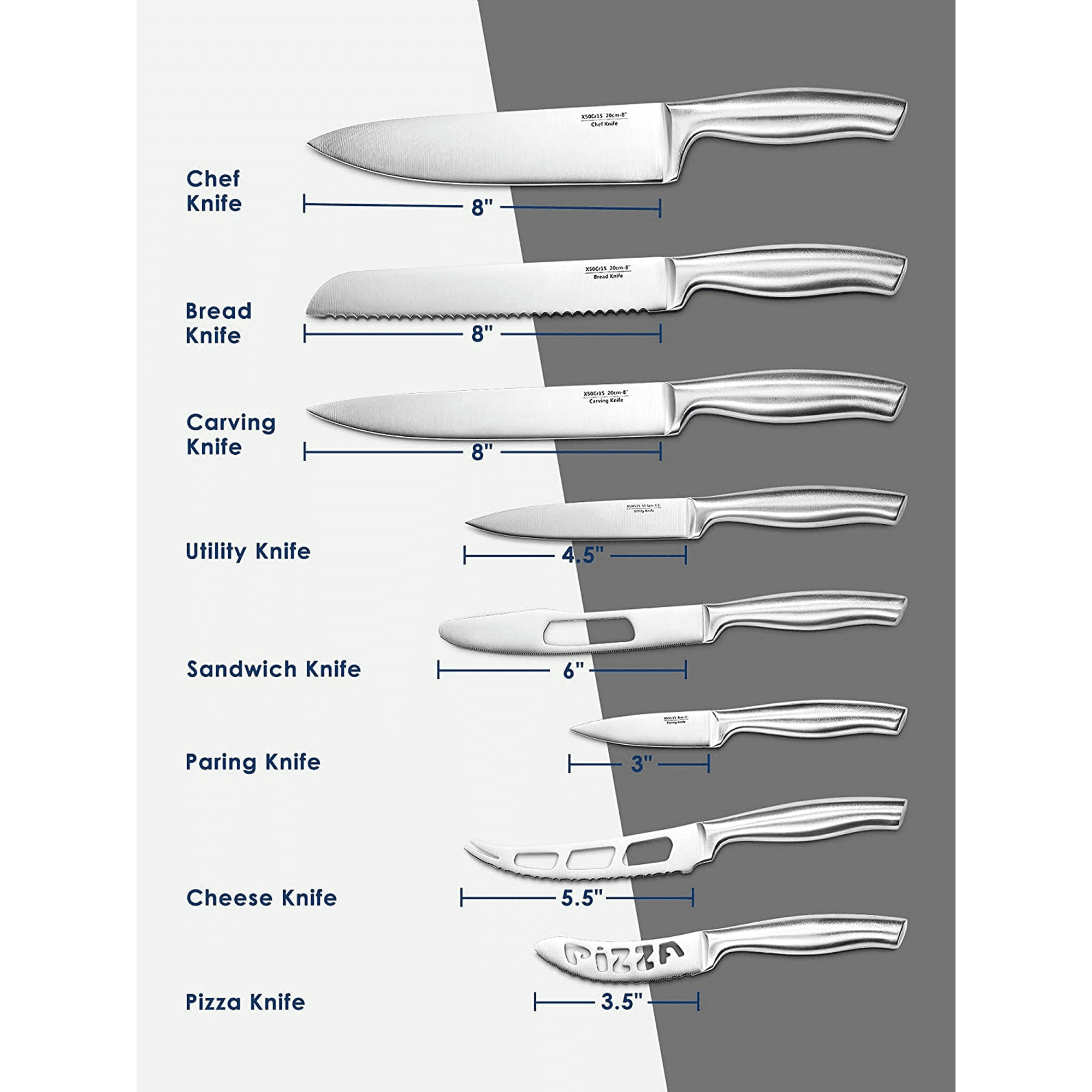 Full knife sets: all the cooking knives you need, 8" chef knife, 8" carving knife, 8" bread knife, 7.5" stainless sharpening steel, shears, 4.5" utility knife, 4.5" steak knife * 6 piece, 3? Paring knife, 6? Sandwich knife, 5.5? Cheese knife, 3.5? Pizza knife, acrylic block