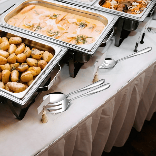 Walchoice 5-piece serving pieces are made of high-grade 18/0 stainless steel without harmful substances and nickel free, ensure healthy and rust-proof for your daily use. Simple streamlined look with mirror finish surface always keep shiny. Great for banquets, reception, hotel buffets, weddings, holiday gatherings on thanksgiving, christmas. The set makes your cooking time easier to enjoy delicious meals!