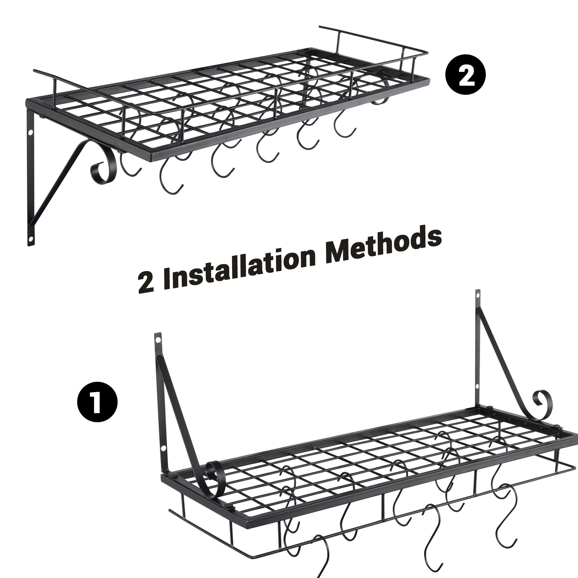 - Versatile Storage - Aquaterior Wall Mount Cookware Rack features 25"x10" large storage shelf for holding pan & pot; keeping large amount of cookware organized and tidy; also great for putting plants at balcony; books in reading room; toiletries in bathroom; 10 removable hooks provide extra storage for hanging towel; spoon and so on
